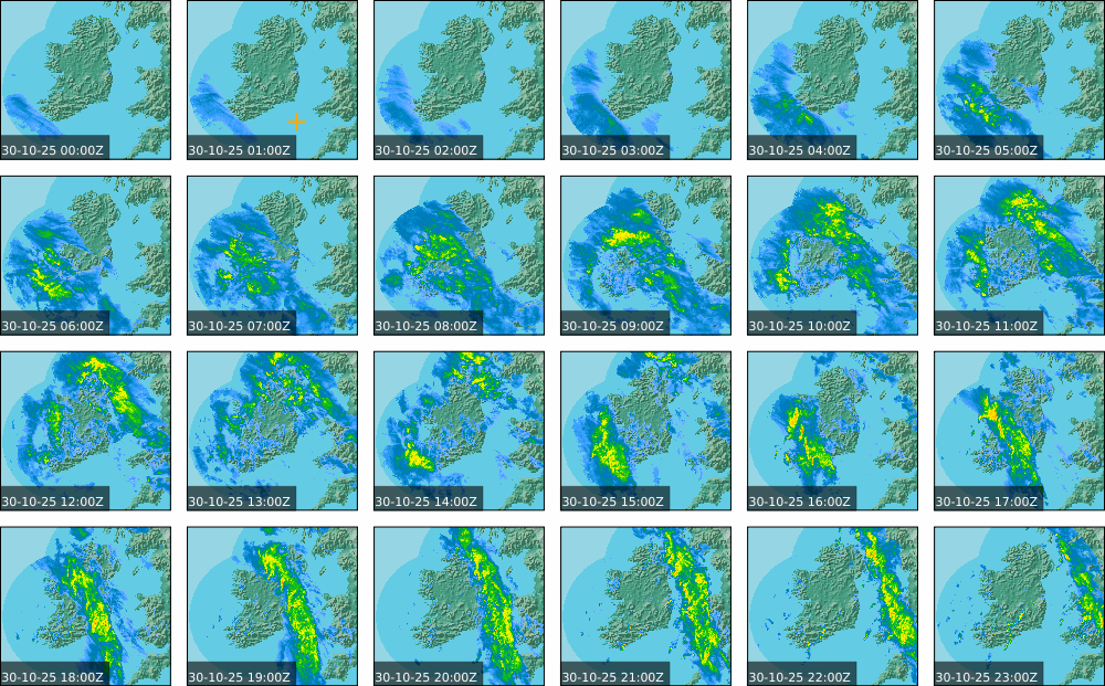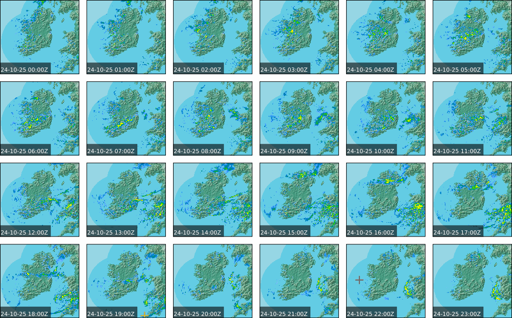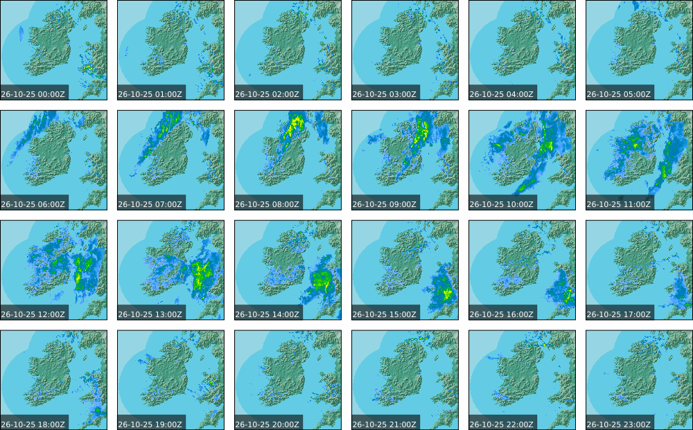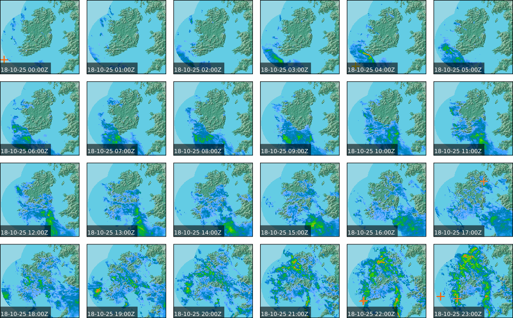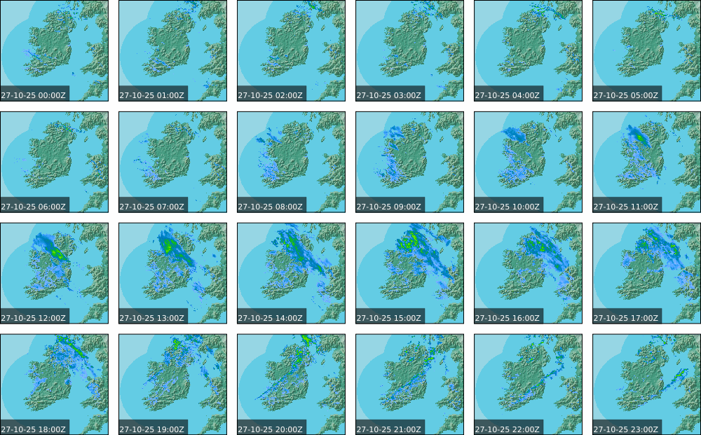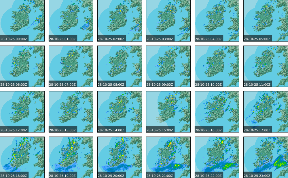 Low pressure of lay over Ireland with an associated wrap around front. High pressure of centred in the Atlantic extended a weak ridge southeast towards Iberia. Widespread showers to start, drier in parts of the North. These showers persisted over the southern half of the country throughout the day and turned heavy at times. Some sunny spells further north, However rain moved in over the north and west in the evening. Coming into nightfall, it was drier with just some patches of rain and drizzle.