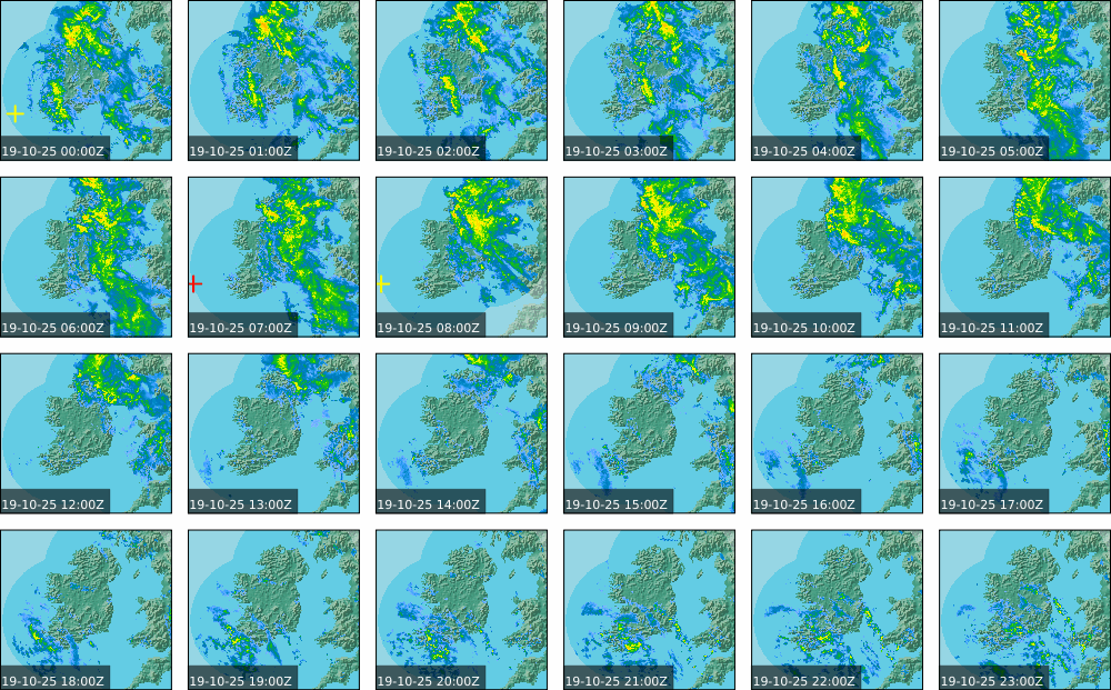 A depression of centred over the Faroe Islands generated a moderate to fresh westerly airflow over Ireland. The morning had sunny spells and scattered showers, along with some patches of drizzle and mist in the west. Cloud increased from the southwest in the early afternoon, followed by outbreaks of rain and showers which spread northwards. The night was wet for the western half of the country with outbreaks of heavy rain.