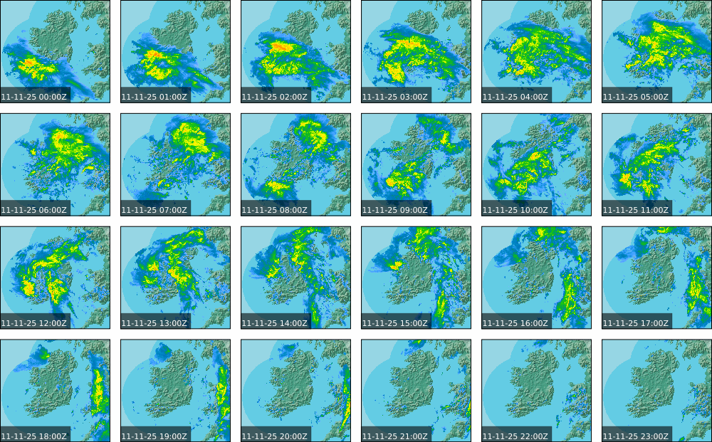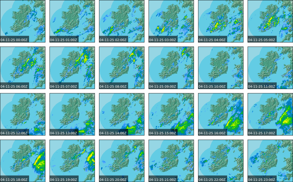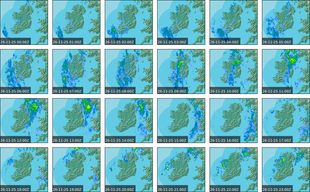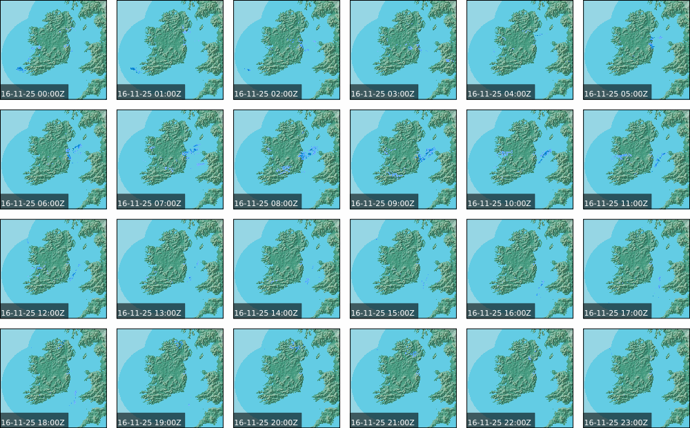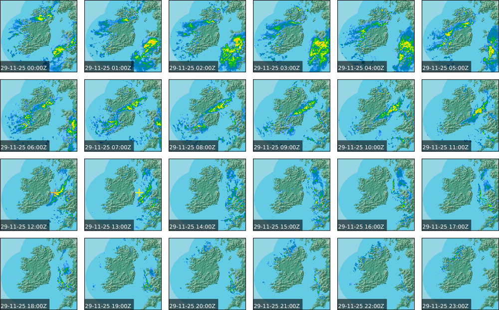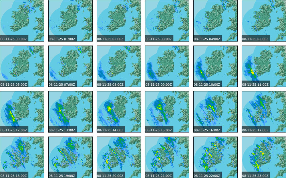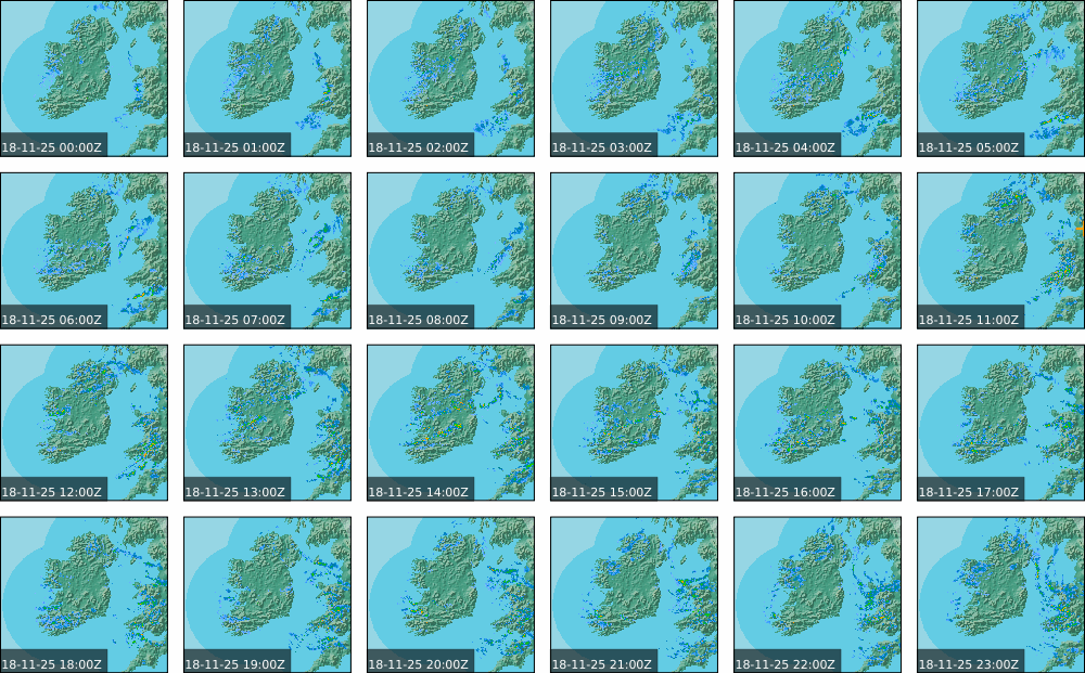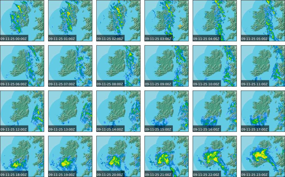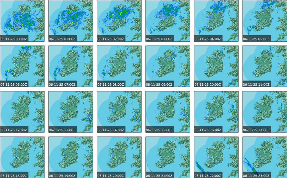 A depression centred south of Iceland maintained a fresh to strong southwesterly airflow over Ireland. Active weather fronts crossed the country from the Atlantic from early in the evening. A clear morning with cloud mainly in the north of the country became overcast over the country of Ireland, building from the west, from approximately midday through to the evening. Scattered showers mainly in the western half of the country through the day became more frequent and a band of rain over Ireland in the late evening and overnight, heaviest in the midlands.