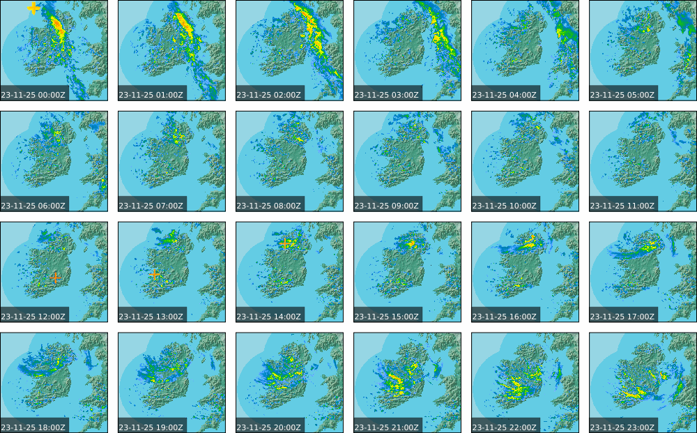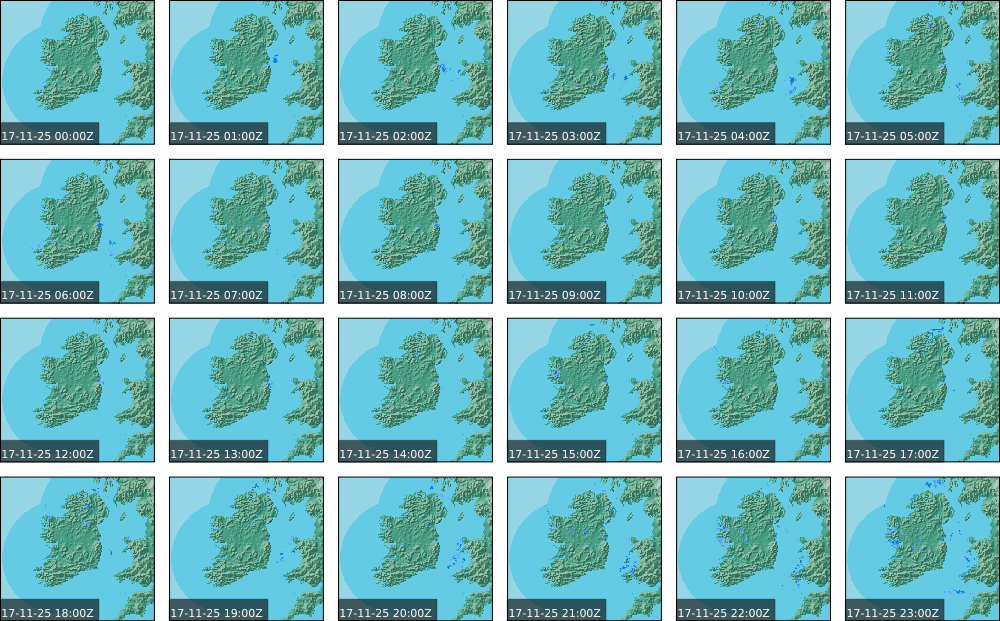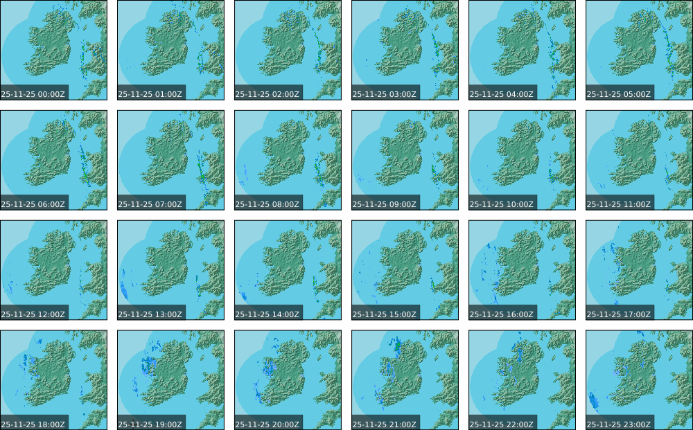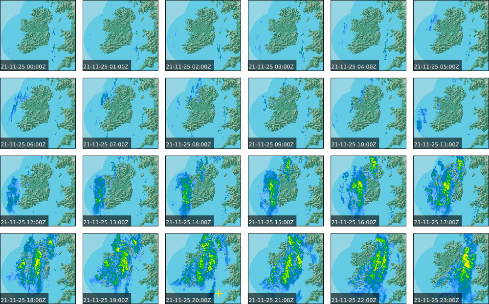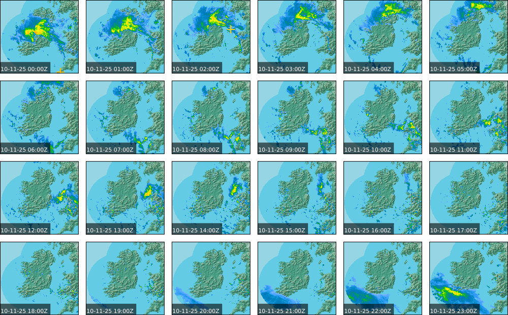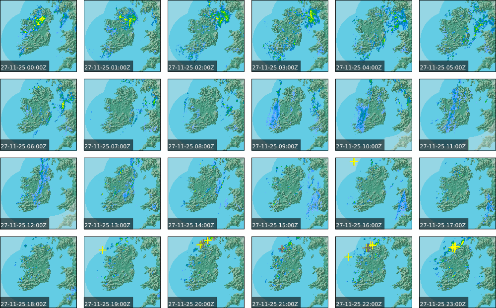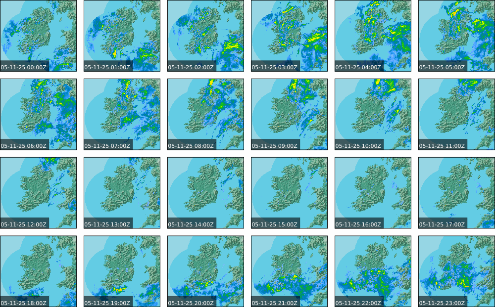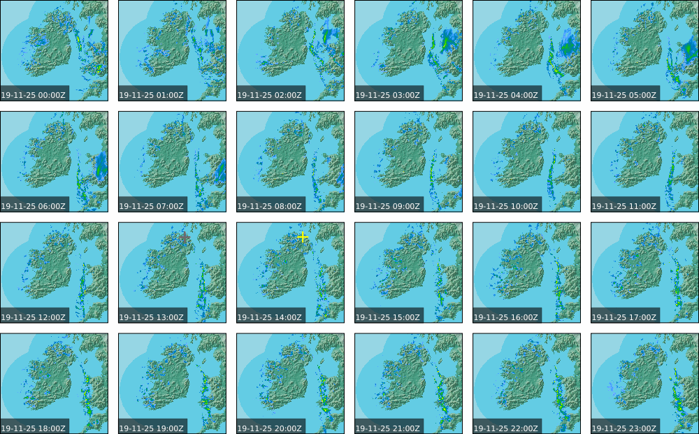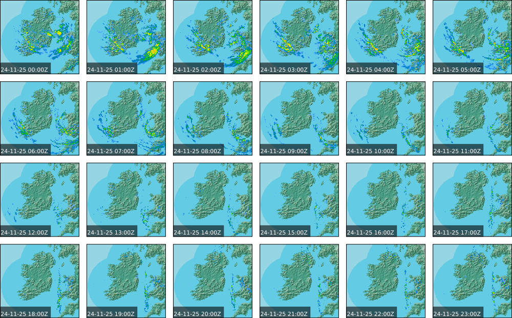 A depression centred south of Iceland maintained a fresh to strong southwesterly airflow over Ireland. Active weather fronts crossed the country from the Atlantic from early in the evening. A clear morning with cloud mainly in the north of the country became overcast over the country of Ireland, building from the west, from approximately midday through to the evening. Scattered showers mainly in the western half of the country through the day became more frequent and a band of rain over Ireland in the late evening and overnight, heaviest in the midlands.