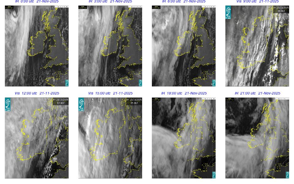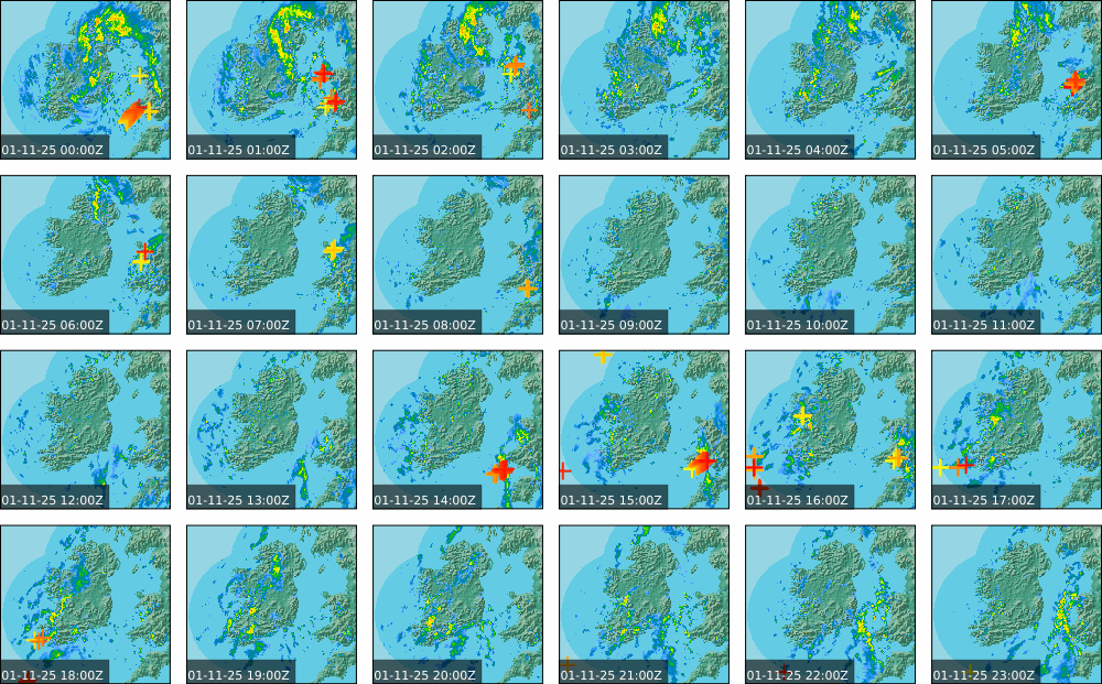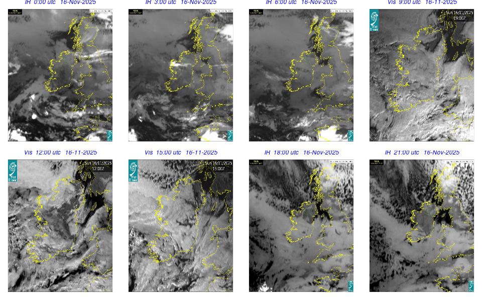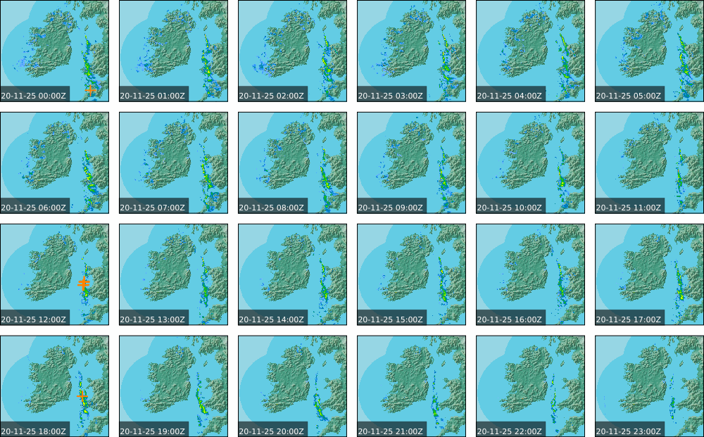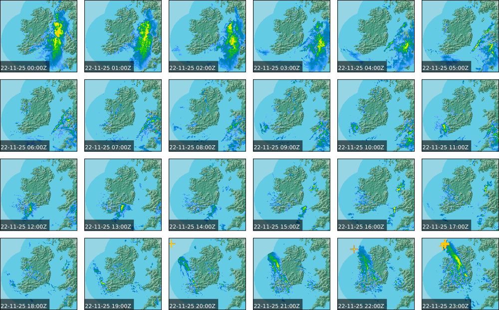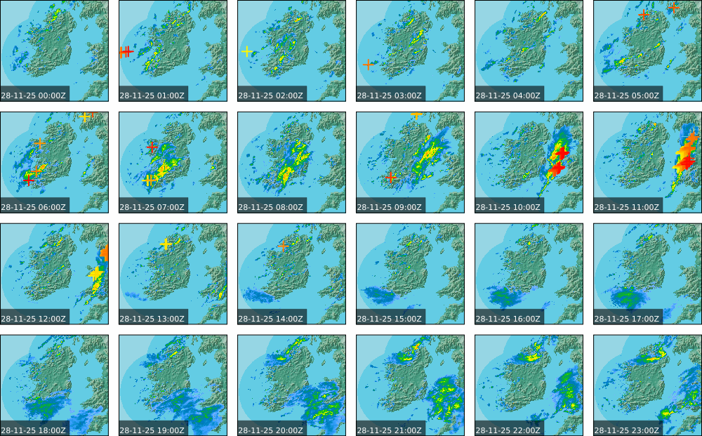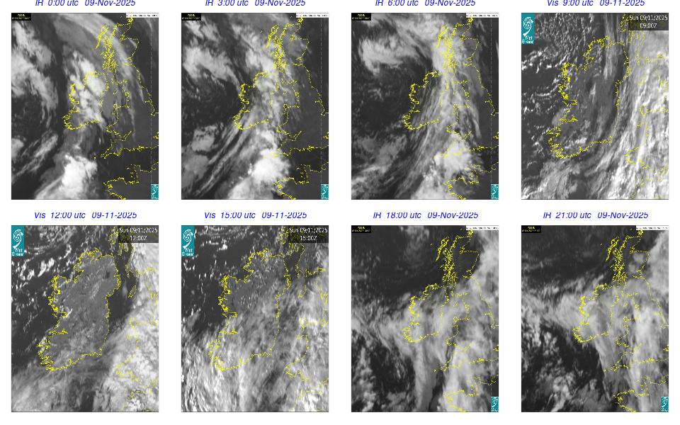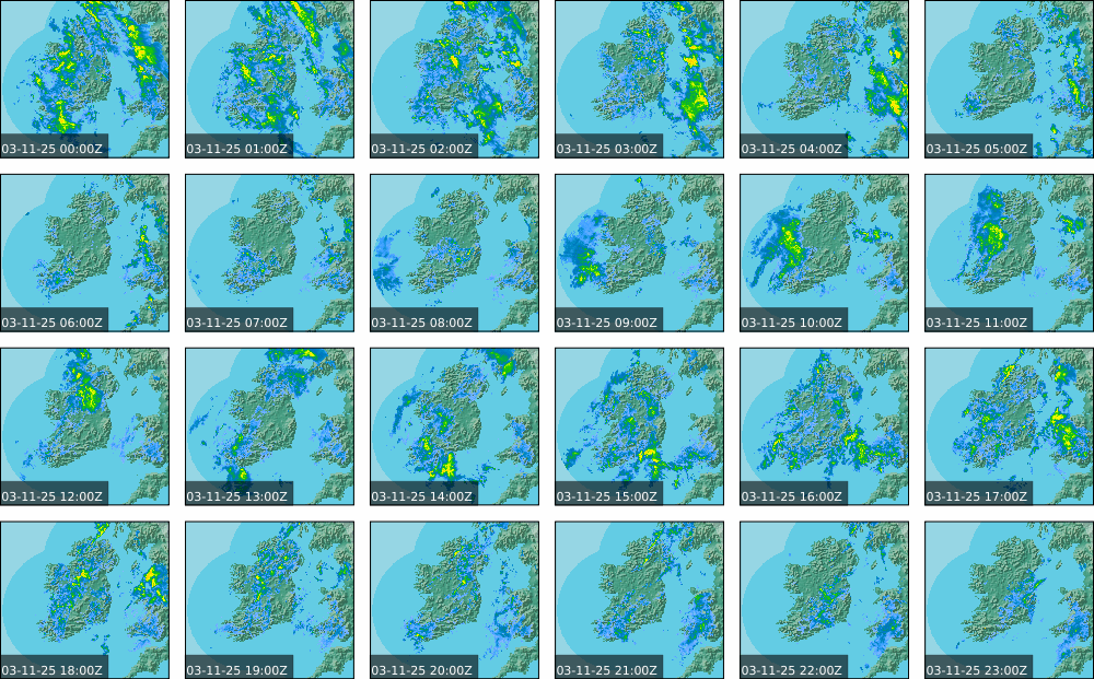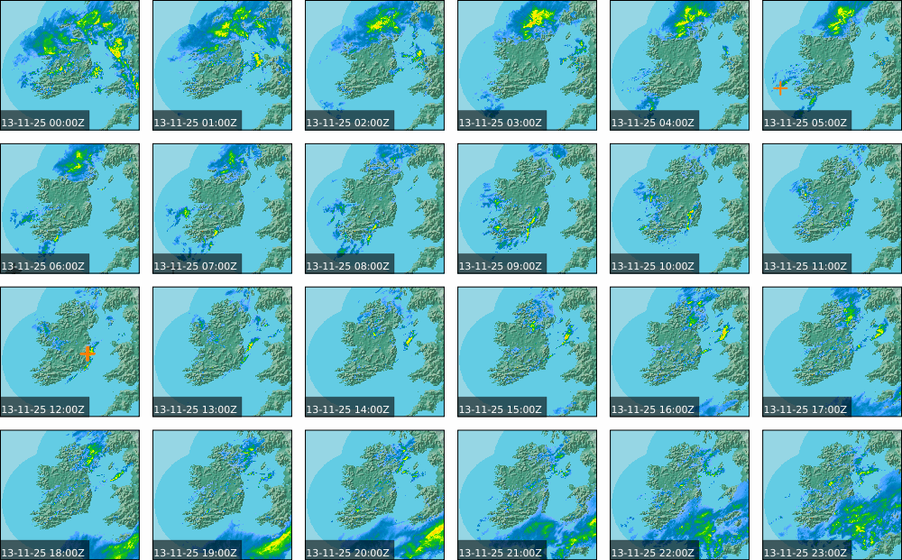 A depression centred south of Iceland maintained a fresh to strong southwesterly airflow over Ireland. Active weather fronts crossed the country from the Atlantic from early in the evening. A clear morning with cloud mainly in the north of the country became overcast over the country of Ireland, building from the west, from approximately midday through to the evening. Scattered showers mainly in the western half of the country through the day became more frequent and a band of rain over Ireland in the late evening and overnight, heaviest in the midlands.
