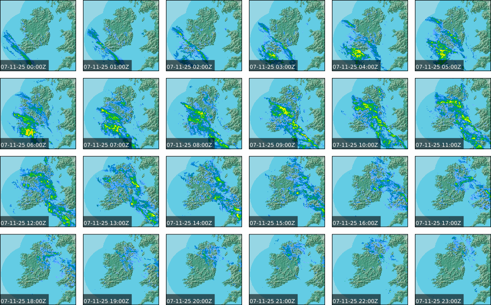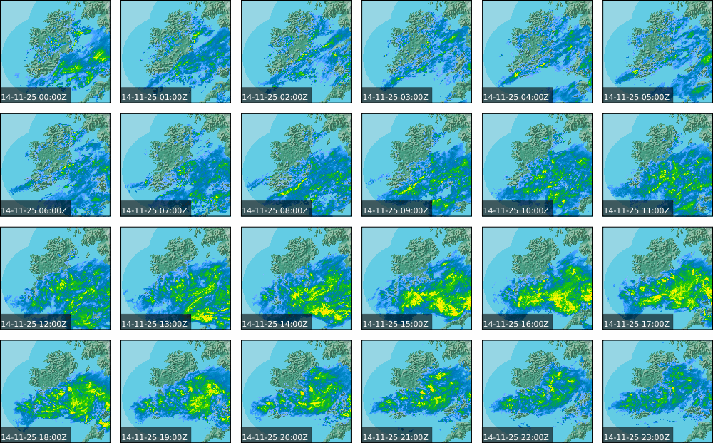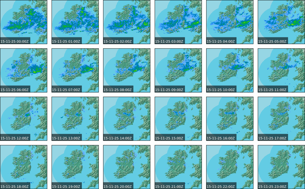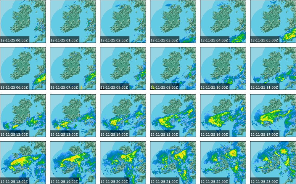 Ireland lay in a mostly moderate southwest to west airflow, generated by a small scale area of low pressure to the northwest of Ireland, extending from a large area of low pressure centred to the south of Greenland. Its associated weather fronts tracked towards the west coast. Some rain and drizzle occurred in the south and west to start. It became cloudier in the South and West with rain developing in western counties in the late morning and then spreading northeastwards to all areas through the afternoon and evening, drier in parts until evening. It turned wet for most of the country in the evening with widespread outbreaks of rain and drizzle spreading from the southwest, persisting in the west and southwest coming into nightfall.