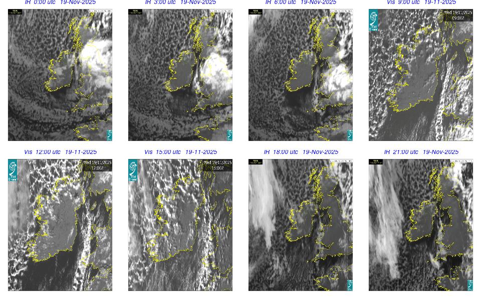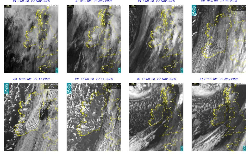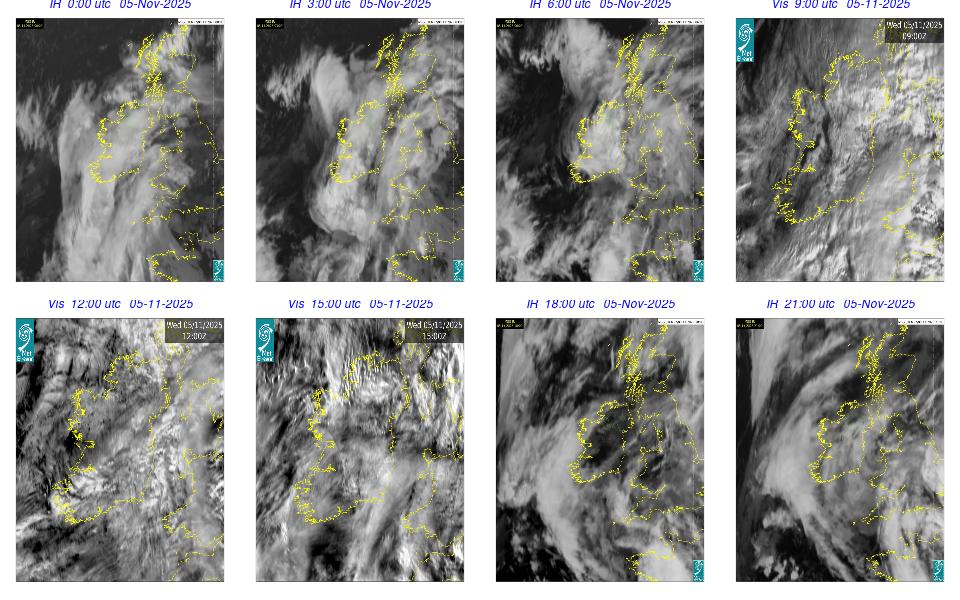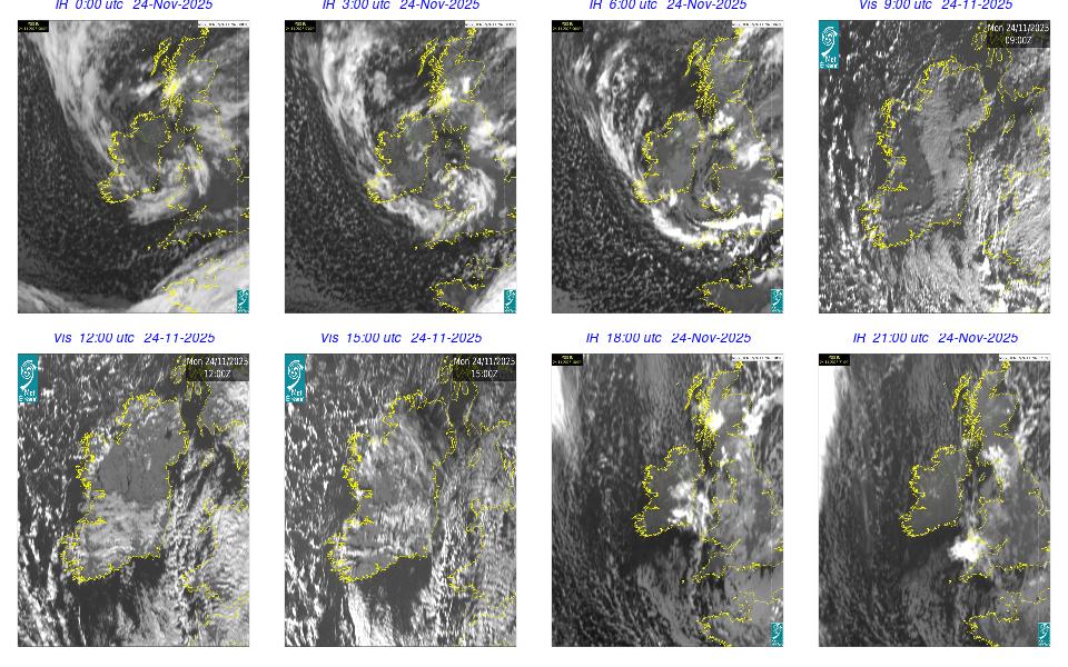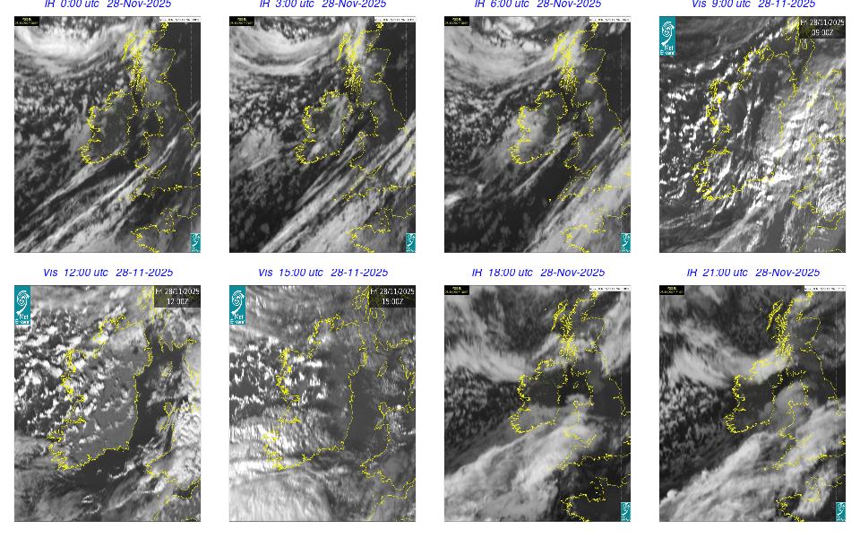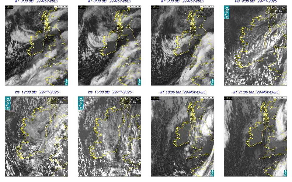 Ireland lay in a complex area of low pressure, with a centre west of the Bay of Biscay. The centre's associated weather fronts moved northwards over Ireland. A cloudy day occurred for most with scattered outbreaks of rain and drizzle mainly over western half of the country and remained confined to the west in the afternoon. Mist and fog patches occurred particularly in the south through the day. The night remained mostly cloudy with patchy light rain along with mist and hill fog in some areas. More persistent rain moved into southwest by following morning.