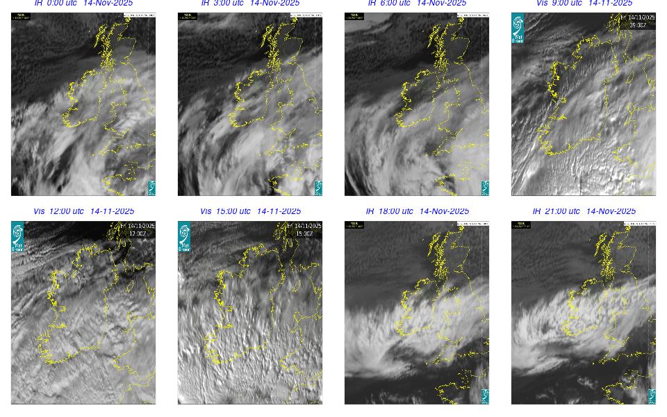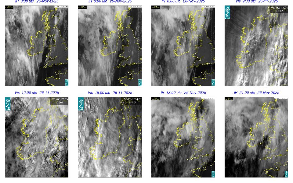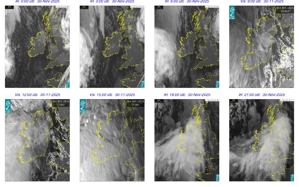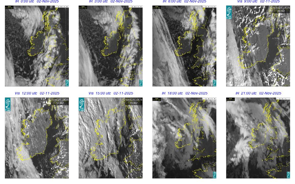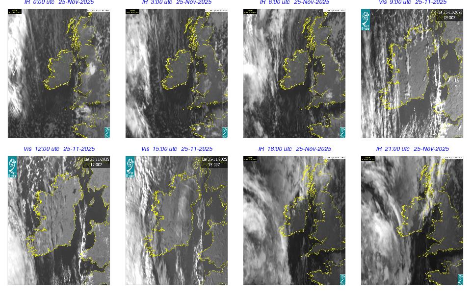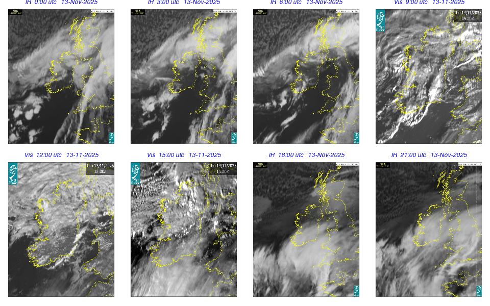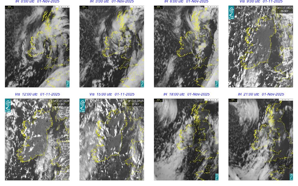Ireland lay in a complex area of low pressure, with a centre west of the Bay of Biscay. The centre's associated weather fronts moved northwards over Ireland. A cloudy day occurred for most with scattered outbreaks of rain and drizzle mainly over western half of the country and remained confined to the west in the afternoon. Mist and fog patches occurred particularly in the south through the day. The night remained mostly cloudy with patchy light rain along with mist and hill fog in some areas. More persistent rain moved into southwest by following morning.